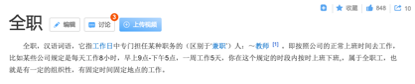 全职,在百度词条里的解释是:“按照公司的正常上班时间去工作,在这个规定的时段内按时上班下班,,属于全职工,有一定的组织性,有固定工作时间固定工作地点。”