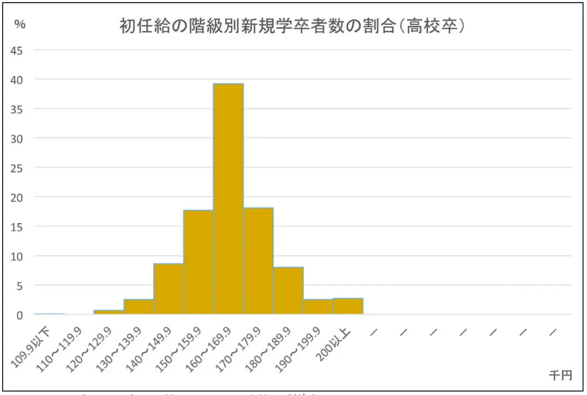 说到毕业生,大家的第一反应是大学毕业生,其实在日本没有读大学,高中毕业后就进入社会工作的人群也不少,所以这里的毕业生也包括高中毕业。根据日本厚生劳动省的数据统计,日本高中毕业生第一份工作的起薪为11万日元到20万日元左右,平均工资16.5万日元左右(约合1万人民币)。男性为16万7千日元,女性为16万2千日元,工资水平多集中在16万日元左右,约占4成( 39.2% )的人是在这一工资区间。由此看出,日本人在高中毕业后的起薪相差不大,起点比较平均。
