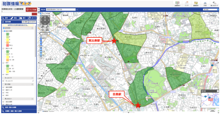 目黑虽然离市中心非常近,但是车站周边犯罪发生的件数也很少,治安良好,生活很方便。推荐给有孩子的家庭、独居女性以及担心治安的外国人。以下是警视厅发布的“犯罪信息地图”,与周边人气的“惠比寿”相比,目黑的犯罪件数也很少。