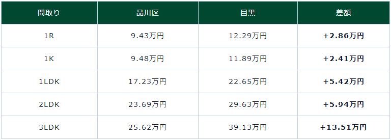 目黑站因为环境很宜居,相应的房租行情也非常高。将目黑站所在的品川区内的平均房租和距目黑站步行10分钟以内的房租行情进行比较。