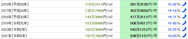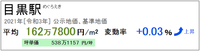 目黑站2021年公示的基准地价为每平方米162.78万日元,多年来呈持续上涨趋势。