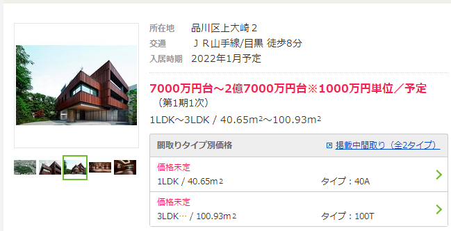 来看具体物件,距目黑站步行8分钟左右,2022年1月交房,面积为40.65㎡-100.93㎡的1LDK-3LDK的新建公寓项目,房价约为7000万-2亿7000万日元。