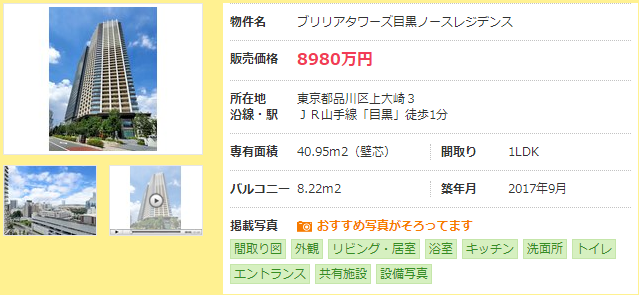 距目黑站步行1分钟左右,2017年9月交房,面积为40.95㎡的1LDK的二手房售价,约为8980万日元。