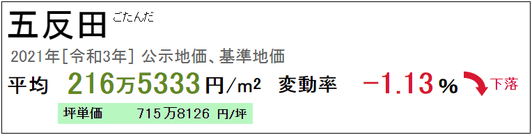 五反田2021年公示的基准地价为每平方米216.5333万日元。由于车站附近商业地块较多,新建住宅用地较少。因受到新冠肺炎疫情的影响,地价约有1.13%的下跌。