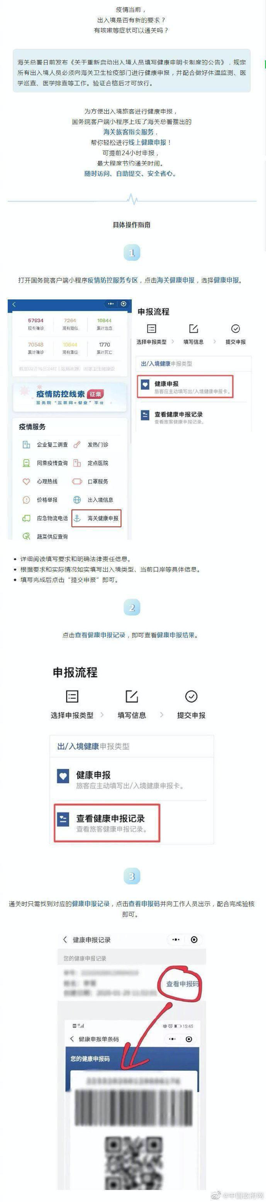 “海关提示:在您出入境时需登陆微信小程序“海关旅客指尖服务”或向海关索取纸质《健康申明卡》进行申报,并配合海关做好卫生检疫工作。”