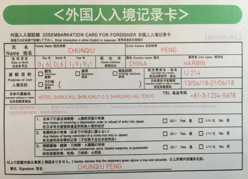 以往我们入境日本之前,可以提前在飞机上填写《海关申报单》和《入境记录卡》。