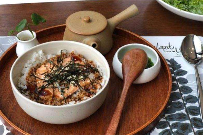 *碗里盛上热米饭,上面撒上鲑鱼末,浇热茶,最后撒上海苔。