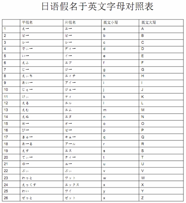 日语假名于英文字母对照表 平假名 片假名 英文小写 英文大写