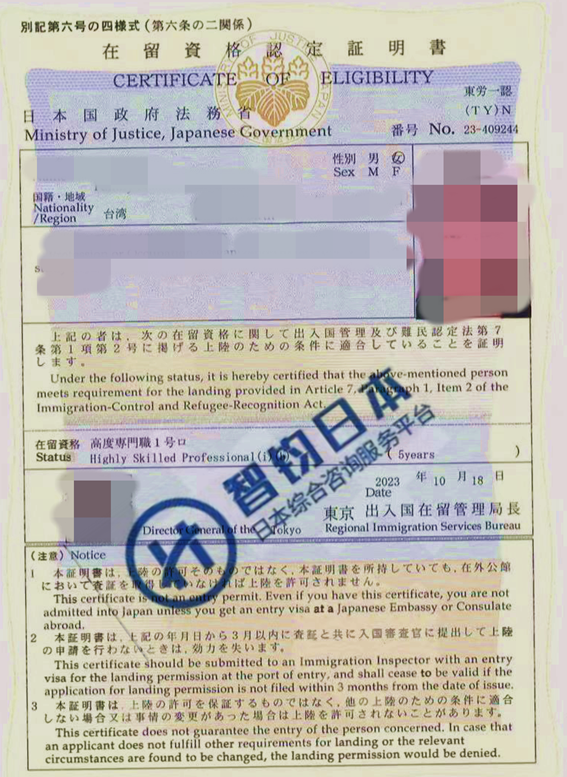 日本高度人才工作签证成功出签分享案例 提交日:2023年10月9日