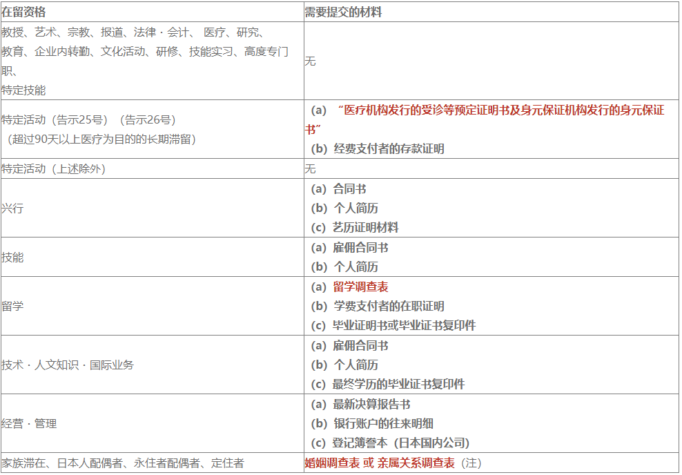 请注意,根据在留资格种类的不同,申请签证时需要提交的材料也有所不同。另外,根据签证审查的需要,有可能使领馆会要求提供其他补充材料。