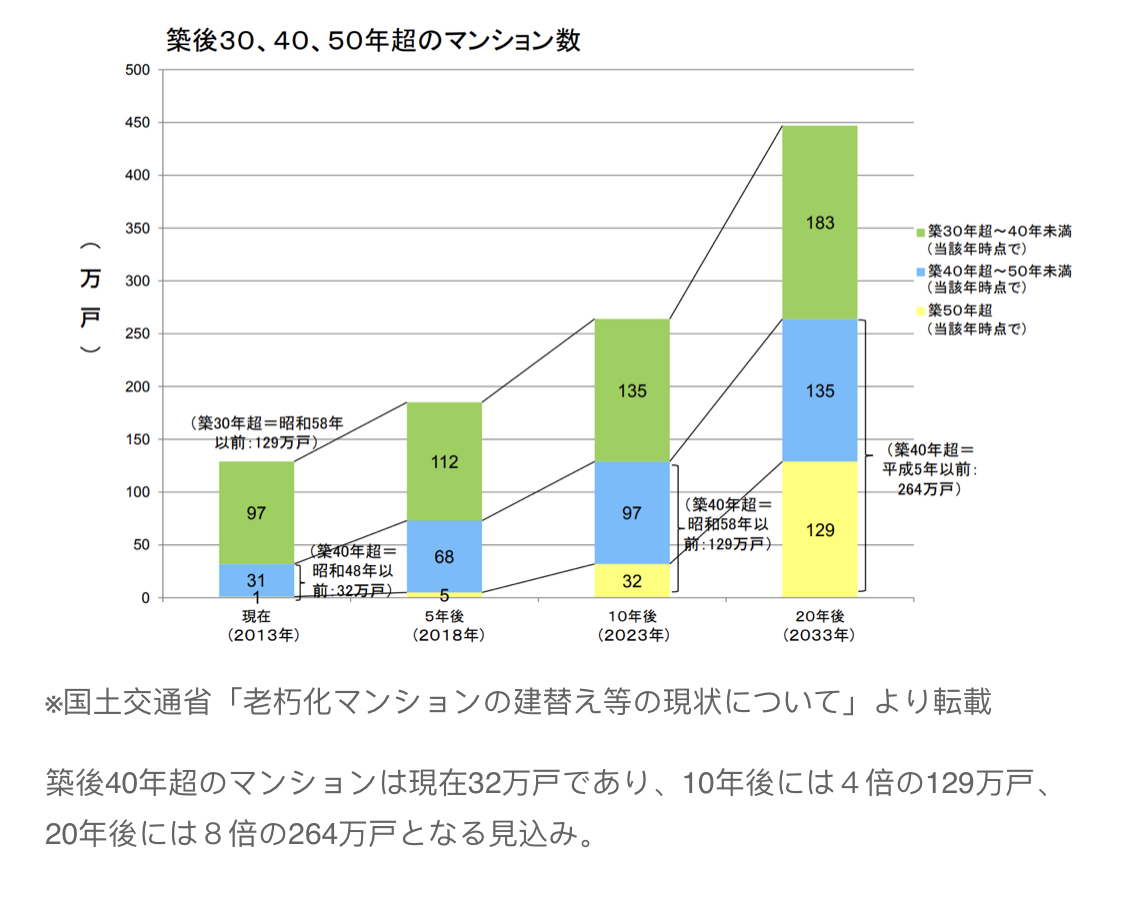 建筑物从理论上来看,即使经过100年也应该可以继续居住。但实际情况会稍有不同——比如旧抗震基准同潤会公寓以构造坚固著称,使用了60~70年就被拆除了。另外,到2016年日本首个分销公寓涉谷的“宫益坂大厦”也就使用了65年。随着社会形势的变化,尽管建筑物还能使用,但是随着经济利益发生改变,从而改变了建筑物自身的寿命,这可以说是经济的寿命吧。区域再开发和区划整理等基础设施建设也是左右公寓寿命的主要原因。