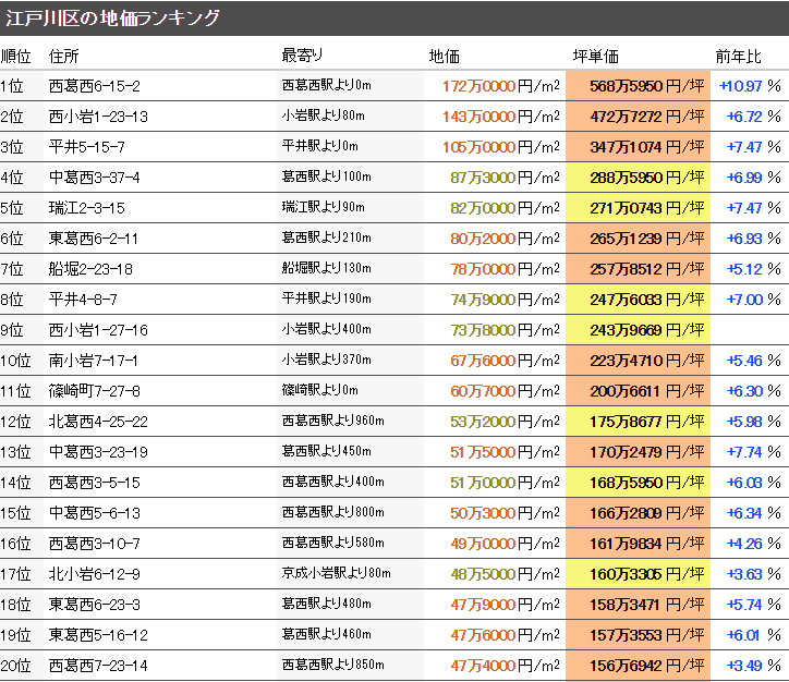东京都江户川区的最高土地价格地点是“江户川区西葛西6-15-2”(172万日元/㎡),最低土地价格地点是“江户川区大杉4-20-4”(26万1000日元/㎡)。