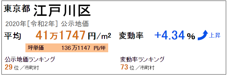 东京都江户川区实际进行的不动产交易价格(国土交通省发表)中,仅限于不包括建筑物(大楼、房屋)的土地交易,计算出了平均价格。因为是实际进行的不动产交易的价格,所以是近似实际价格的价格。江户川区的土地交易价格为2019年(平成31年)第一季度~第二季度,平米单价32万5754日元/㎡,坪单价107万6873日元/坪,前年变动率-5.23%。这个平均交易价格与上述公布的公示地价、基准地价的平均值相比,有-19.87%的差异。
