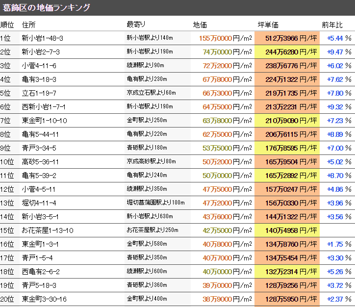 东京都葛饰区的最高土地价格地点是“葛饰区新小岩1-48-3”(155万0000日元/㎡),最低土地价格地点是“葛饰区西水元3-20-9”(16万4000日元/㎡)。