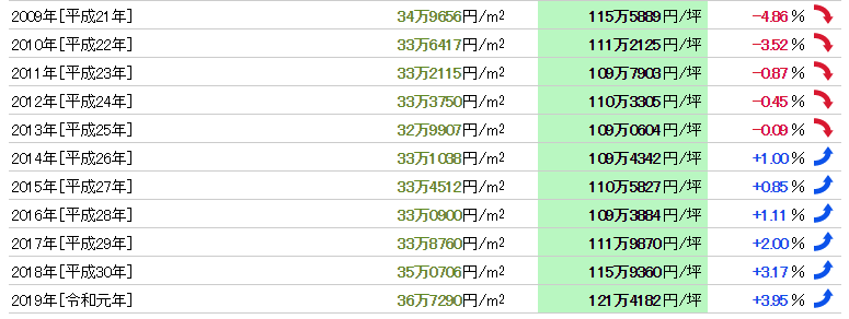 从1983年(昭和58年)开始37年的数据,公示地价的最高值是80万5052日元/㎡(1991年),最低价格是30万1214日元/㎡(1983年),两者的差异是2.77倍。基准地价的最高值是92万3928日元/㎡(1991年),最低价格是30万3476日元/㎡(2005年),两者的差异是3.04倍。