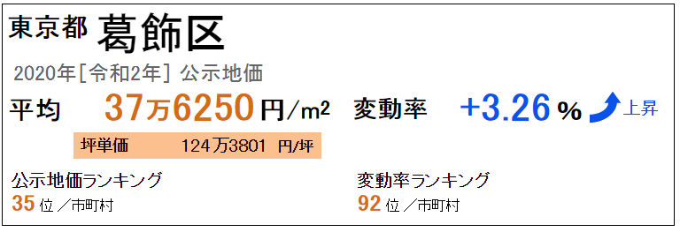 东京都葛饰区的最新公示地价平米单价平均37万6250日元/㎡(2020年“令和2年”),坪单价平均124万3801日元/坪,全国排名35位。从去年开始的变动率是+3.26%,变动率的全国排名是92位。