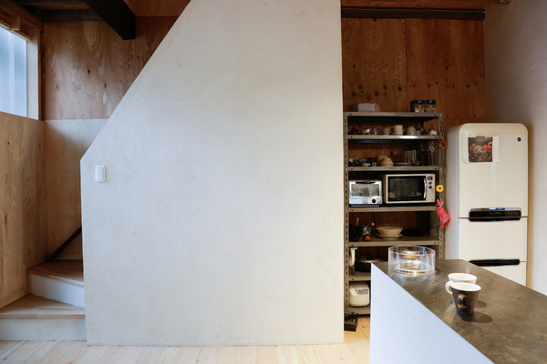 对于二层的卧室部分,小川武则直接使用了木板墙壁的原色,没有刷漆也没有铺壁纸,他喜欢这种纯纯的自然风格。因为二层的部分地板被拆除,所以留下的二层空间也使用了波浪型的采光板作为墙壁,这样也兼顾了隐私、采光和感受植物影子的需求。