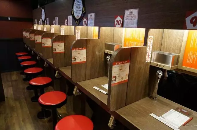 比如适合一个人用餐的隔断式餐位,就是专门为单身食客准备的。因为餐厅里大多是4人位的餐桌,后来也出现了2人位的餐桌,但是当一个人吃饭的时候,有可能会一个人占了整张桌子,因为日本没有“拼桌”的习惯,单身食客往往觉得自己占了便宜、浪费了资源、给店家造成了损失,有额外的精神负担,所以在隔断式一人餐位用餐时,就会感到轻松自在多了。