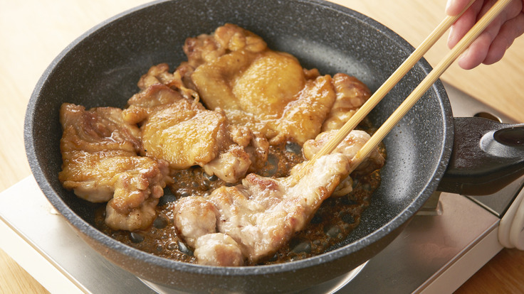 6. 将平底锅的底油擦干净,放入之前调好的照烧酱汁加热后,再放入刚刚煎好的鸡肉,让肉充分裹上酱汁。