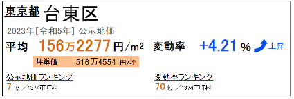 2023年(令和5年)发布的最新公示地价显示,东京都台东区的土地价格为平均每平方米1,562,277日元,每坪平均价格为5,164,554日元,日本全国排名第7。与前一年相比涨幅为4.21%,涨幅在日本全国排名第70位。