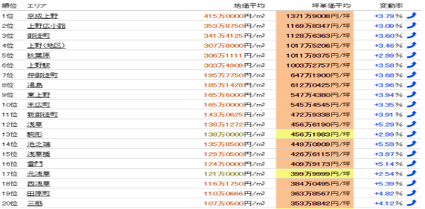 同时2022年(令和4年)发布的最新基准地价显示,台东区最新的标准地价为平均每平方米151万4555日元(截至2022年(令和4年)),每坪平均价格为500万6795日元,日本全国排名第7。与前一年相比涨幅为2.64%,涨幅在日本全国排名第104位。