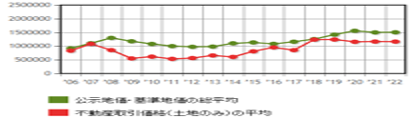 在实际进行的台东区房地产交易中,国土交通省仅计算了不包括建筑物(例如大楼或房屋)的土地销售交易的平均价格。由于这些均是来自实际房地产交易的价格,因此它们更接近台东区土地销售的市场价格。台东区的土地交易价格在2022年(令和4年)第1季度为每平方米116.5万日元,每坪385万1239日元,较去年同期下降0.11%。这个平均交易价格与公示地价和基准地价的平均值相比,下降了22.57%。