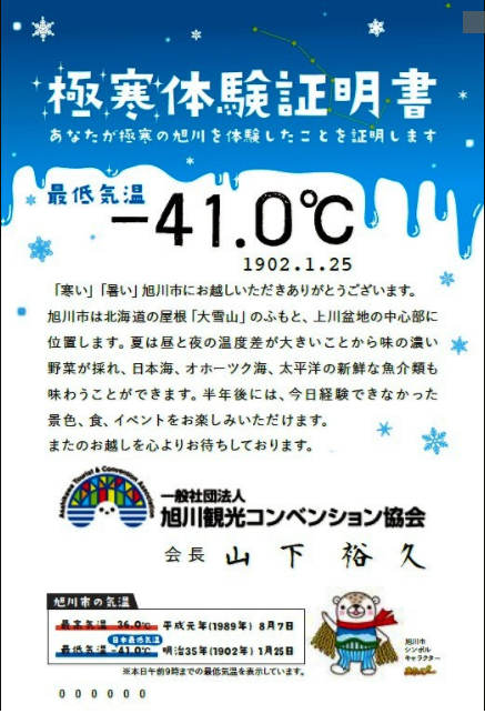 旭川市是北海道仅次于札幌市的第二大城市。12月23日起,旭川观光会议协会开始发行“极寒体验证明书”,意在让游客将北海道旭川的寒冷体验当作土特产带回家。