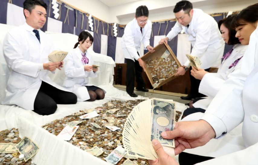 神社院内放置的约50处“香油钱箱”被集中在一起,由7位身着白色工作服的银行工作人员进行分类清点。据悉,清点统计工作经由人工及机械等方式进行,耗时为5天左右。除了日元以外,“香油钱”中还出现了人民币、美元等外币,以及金额为“11104日元”(日语发音いいとし,与“好年景”谐音)的支票等。