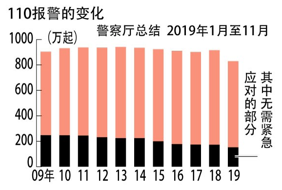 据悉,2019年日本警察厅共受理了829万9775起报警,较2018年同期减少了5万9937起。无需紧急应对的通报为152万4542起,较2018年同期减少7万9179起。