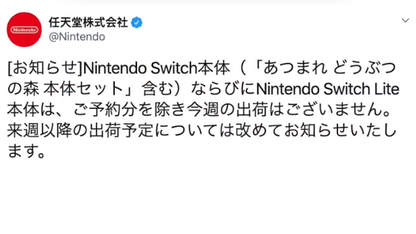 任天堂公司表示,停止发货的原因除了因新冠肺炎疫情扩大给公司生产带来的影响外,还由于因疫情而实施的全国中小学统一停课措施等原因,导致家庭游戏机的需求量急速增长。另外,3月20日发布的新款人气软件《集合啦!动物森友会》一经上市发售,便在短期内畅销260万套以上,游戏机主机的需求量也随之增加,也被认为是原因之一。