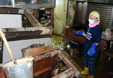 据经营该店的上村惠子回忆,她曾于7月4日上午7点左右与4位店员一起去查看店铺的情况,刚到店里高及膝盖的洪水立即涌了进来。“快关门!”在店员叫声响起的瞬间,水流冲破了大门。大家急忙上到三楼避难,但没过几分钟,水已经漫至二楼地板以上30厘米左右。