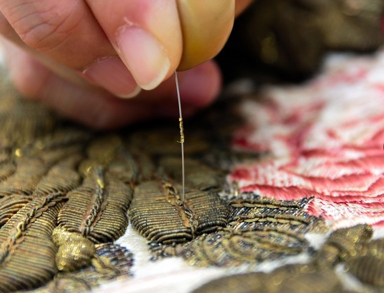 据文献等资料记载,该礼服此前一直被认为是在德国定制的,但在修复过程中,修复人员在揭下礼服衬料时,在刺绣的背面发现了标有汉字的和纸增强材料,由此可以推断出刺绣是在日本进行的。