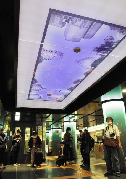 改装后的银座站在各条线路检票口的天花板上,用LED屏幕投映出了路面街道的图像,从而使乘客们可以轻松掌握自己处于银座的什么地方。除此以外,银座线站台的墙壁上还描绘了这100年间银座街道的变迁。