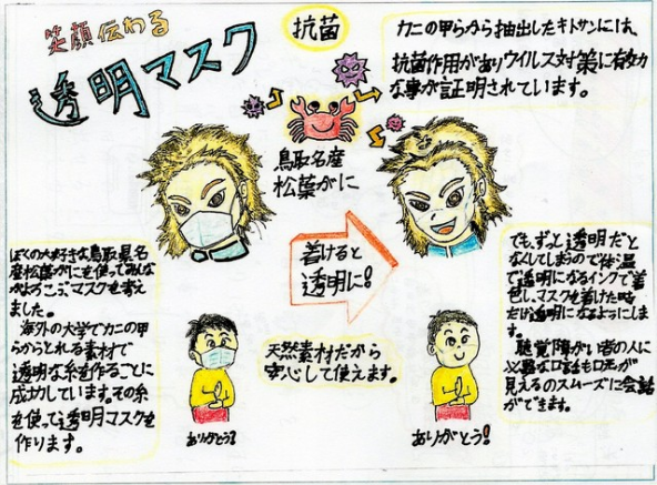 北本遥煌获得最高奖的创意主题是“传递笑容!透明口罩”。用提取自鸟取县特产松叶蟹甲壳的素材制成透明纱线,再用这种纱线制成口罩。即使在疫情期间戴口罩的情况下,也能看到佩戴人的表情,理解唇部动作等,因此即使是有听觉障碍的人士也容易沟通。