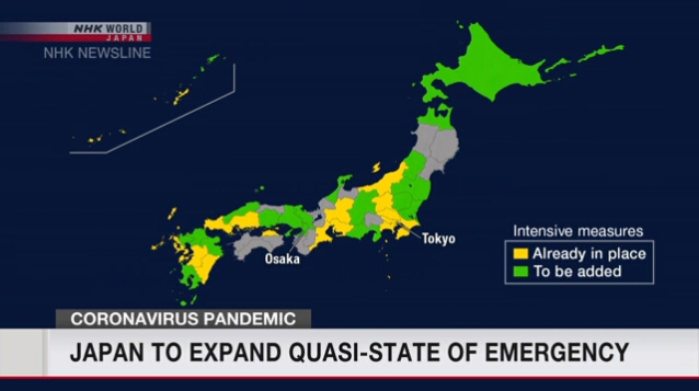 在新冠疫情在日本国内急速扩散的情况下,除关西在内的3个府县以外,还有18个道府县被列入防止疫情蔓延等重点措施适用地区。如此一来,日本全国将在34个都道府县实施防止疫情蔓延等重点措施。