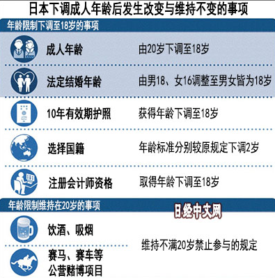 此次修正案是日本自1876年规定成人年龄为20岁以来的首次下调。根据新规,日本青少年在满18岁后,可不经父母等同意签订贷款、信用卡合同等。但未满20岁仍不得参与饮酒、吸烟、赌马等公营博彩活动的年龄限制保持不变。