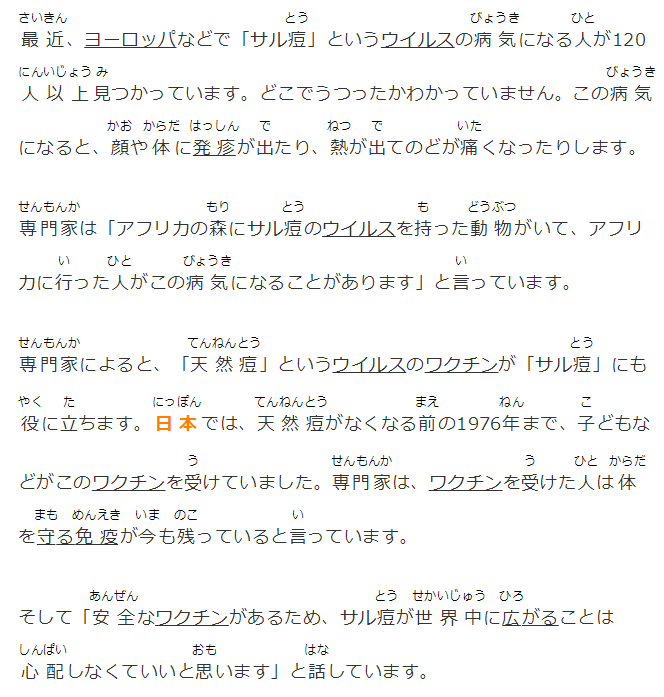 専門家によると、「天然痘」というウイルスのワクチンが「サル痘」にも役に立ちます。日本では、天然痘がなくなる前の1976年まで、子どもなどがこのワクチンを受けていました。専門家は、ワクチンを受けた人は体を守る免疫が今も残っていると言っています。