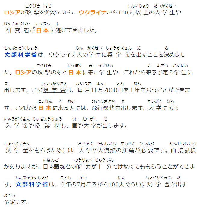 文部科学省は、ウクライナ人の学生に奨学金を出すことを決めました。ロシアの攻撃のあと日本に来た学生や、これから来る予定の学生に出します。この奨学金は、毎月11万7000円を1年もらうことができます。これから日本に来る人には、飛行機代も出します。大学に払う入学金や授業料も、国や大学が出します。