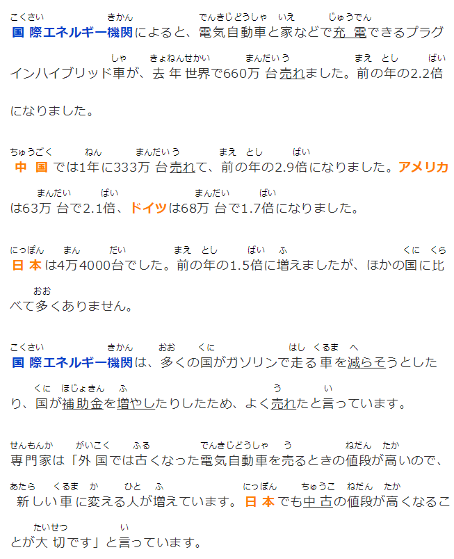 国際エネルギー機関は、多くの国がガソリンで走る車を減らそうとしたり、国が補助金を増やしたりしたため、よく売れたと言っています。