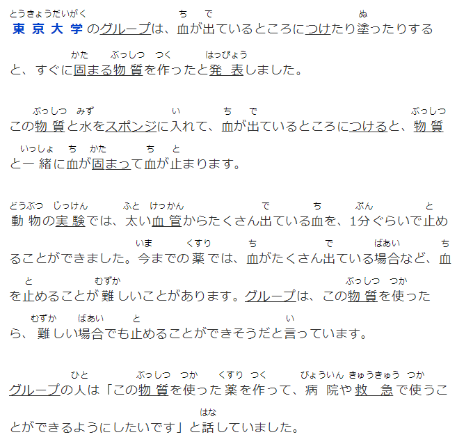 東京大学のグループは、血が出ているところにつけたり塗ったりすると、すぐに固まる物質を作ったと発表しました。