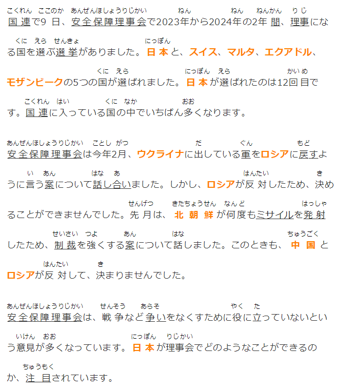 国連で9日、安全保障理事会で2023年から2024年の2年間、理事になる国を選ぶ選挙がありました。日本と、スイス、マルタ、エクアドル、モザンビークの5つの国が選ばれました。日本が選ばれたのは12回目です。国連に入っている国の中でいちばん多くなります。