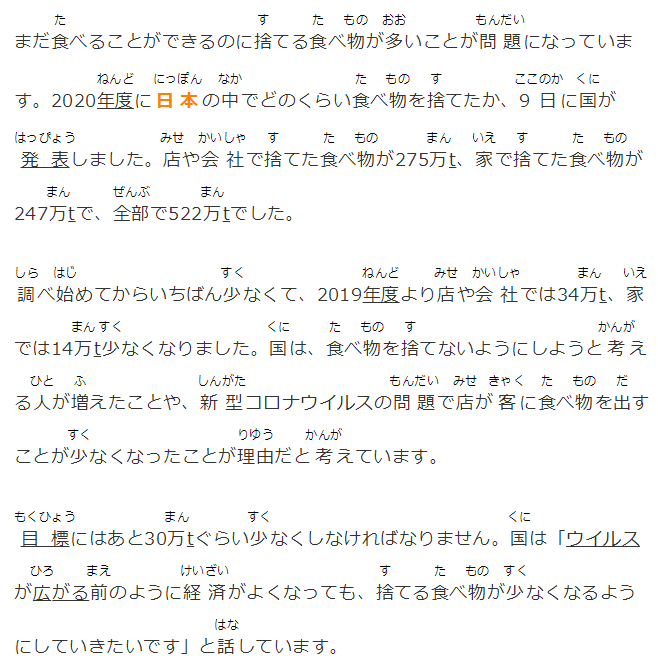 まだ食べることができるのに捨てる食べ物が多いことが問題になっています。2020年度に日本の中でどのくらい食べ物を捨てたか、9日に国が発表しました。店や会社で捨てた食べ物が275万t、家で捨てた食べ物が247万tで、全部で522万tでした。
