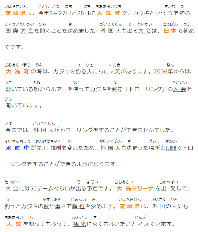 茨城県は、今年8月27日と28日に大洗町で、カジキという魚を釣る国際大会を開くことを決めました。外国人も出る大会は、日本で初めてです。