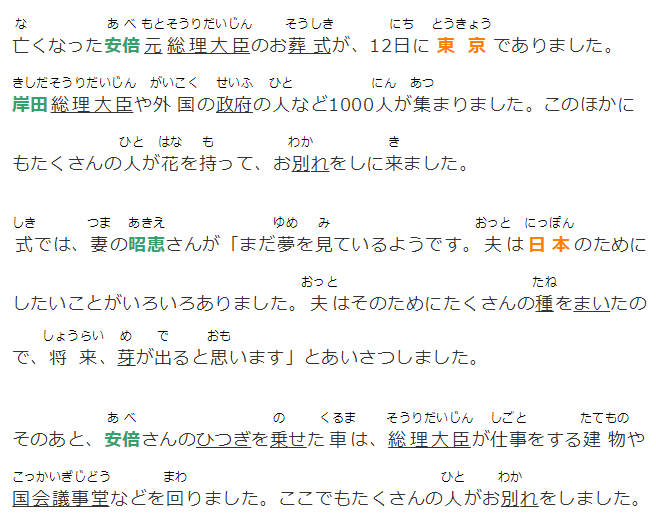 亡くなった安倍元総理大臣のお葬式が、12日に東京でありました。岸田総理大臣や外国の政府の人など1000人が集まりました。このほかにもたくさんの人が花を持って、お別れをしに来ました。