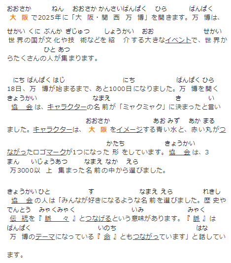 協会の人は「みんなが好きになるような名前を選びました。歴史や伝統を『脈々』とつなげるという意味があります。『脈』は万博のテーマになっている『命』ともつながっています」と話しています。