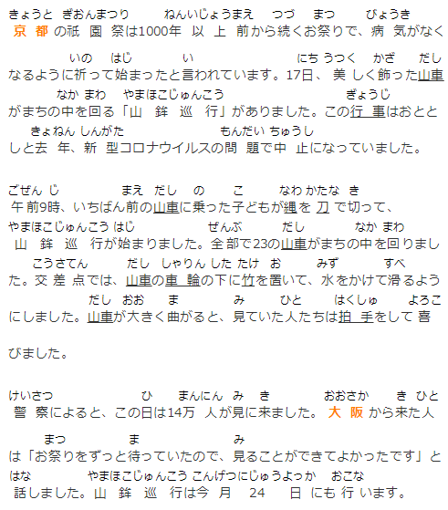 京都の祇園祭は1000年以上前から続くお祭りで、病気がなくなるように祈って始まったと言われています。17日、美しく飾った山車がまちの中を回る「山鉾巡行」がありました。この行事はおととしと去年、新型コロナウイルスの問題で中止になっていました。