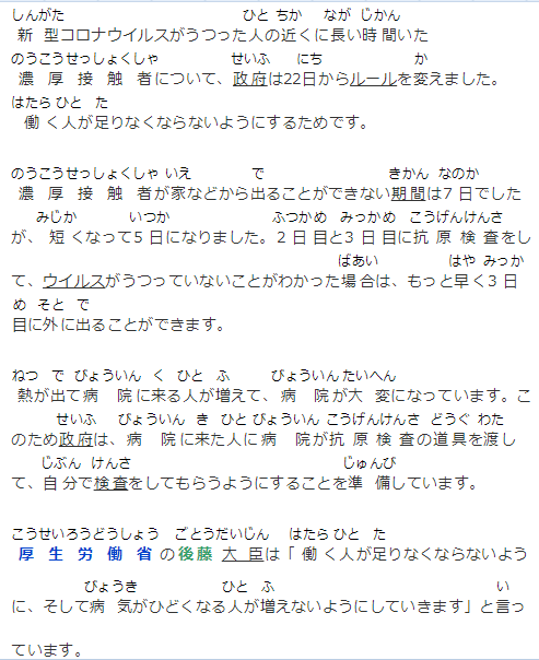 新型コロナウイルスがうつった人の近くに長い時間いた濃厚接触者について、政府は22日からルールを変えました。働く人が足りなくならないようにするためです。