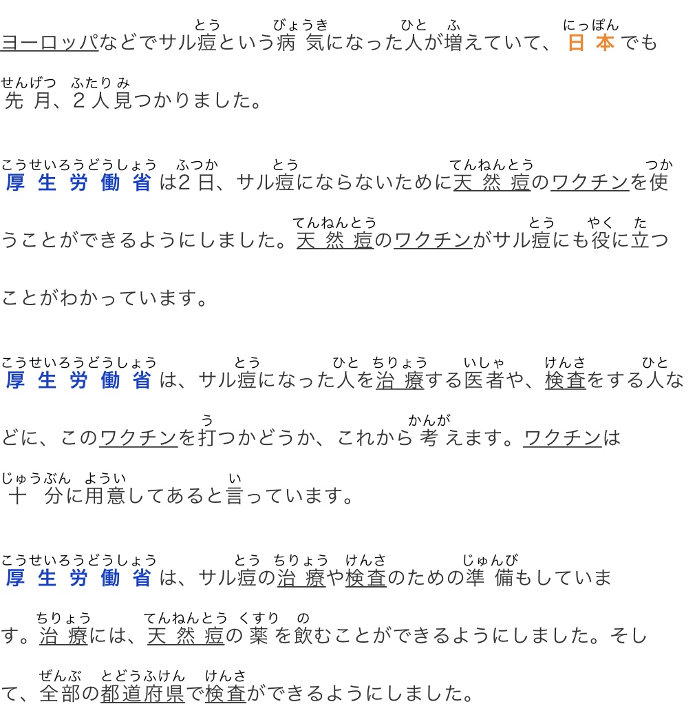 厚生労働省は、サル痘の治療や検査のための準備もしています。治療には、天然痘の薬を飲むことができるようにしました。そして、全部の都道府県で検査ができるようにしました。