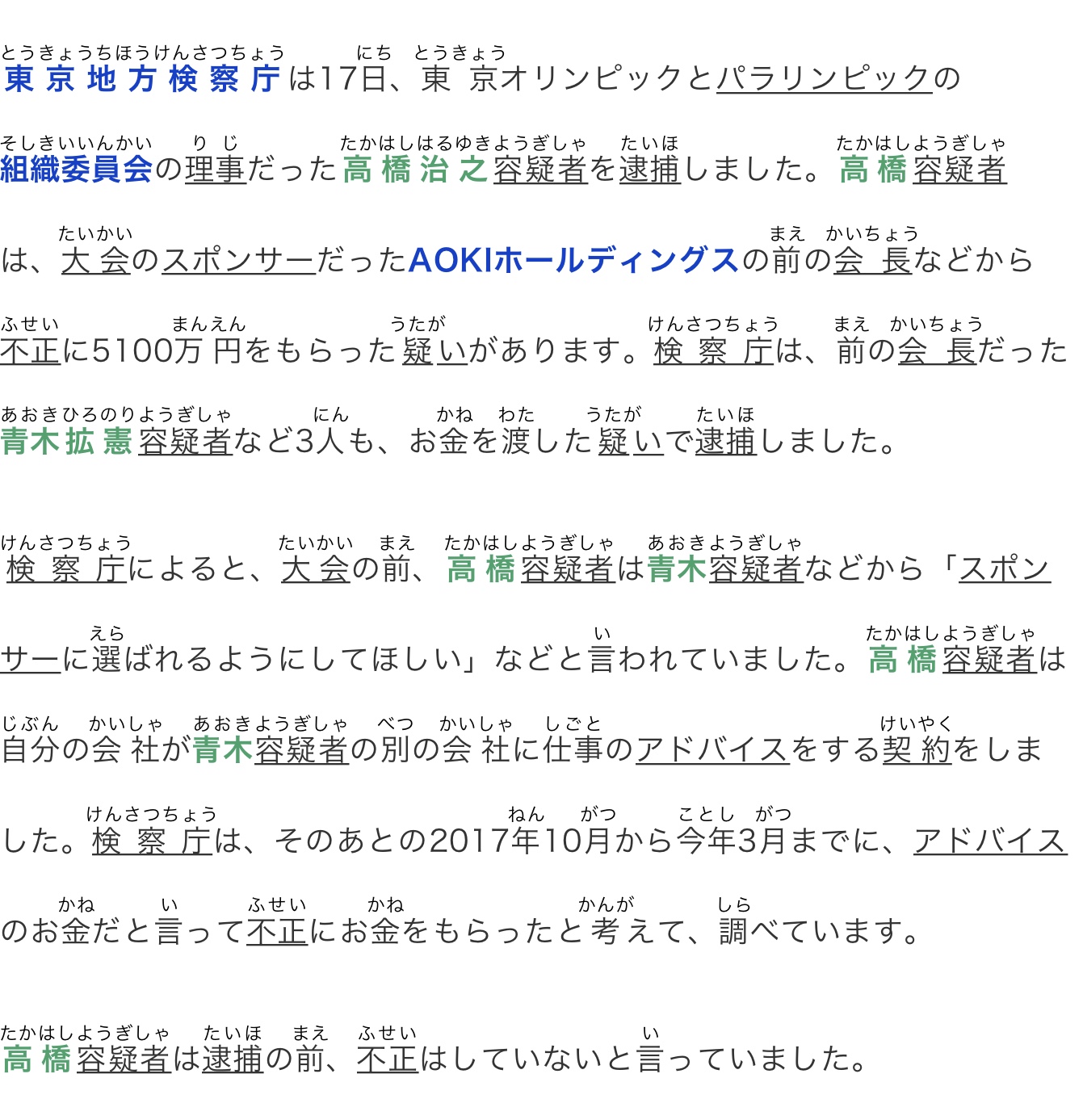 検察庁によると、大会の前、高橋容疑者は青木容疑者などから「スポンサーに選ばれるようにしてほしい」などと言われていました。高橋容疑者は自分の会社が青木容疑者の別の会社に仕事のアドバイスをする契約をしました。検察庁は、そのあとの2017年10月から今年3月までに、アドバイスのお金だと言って不正にお金をもらったと考えて、調べています。