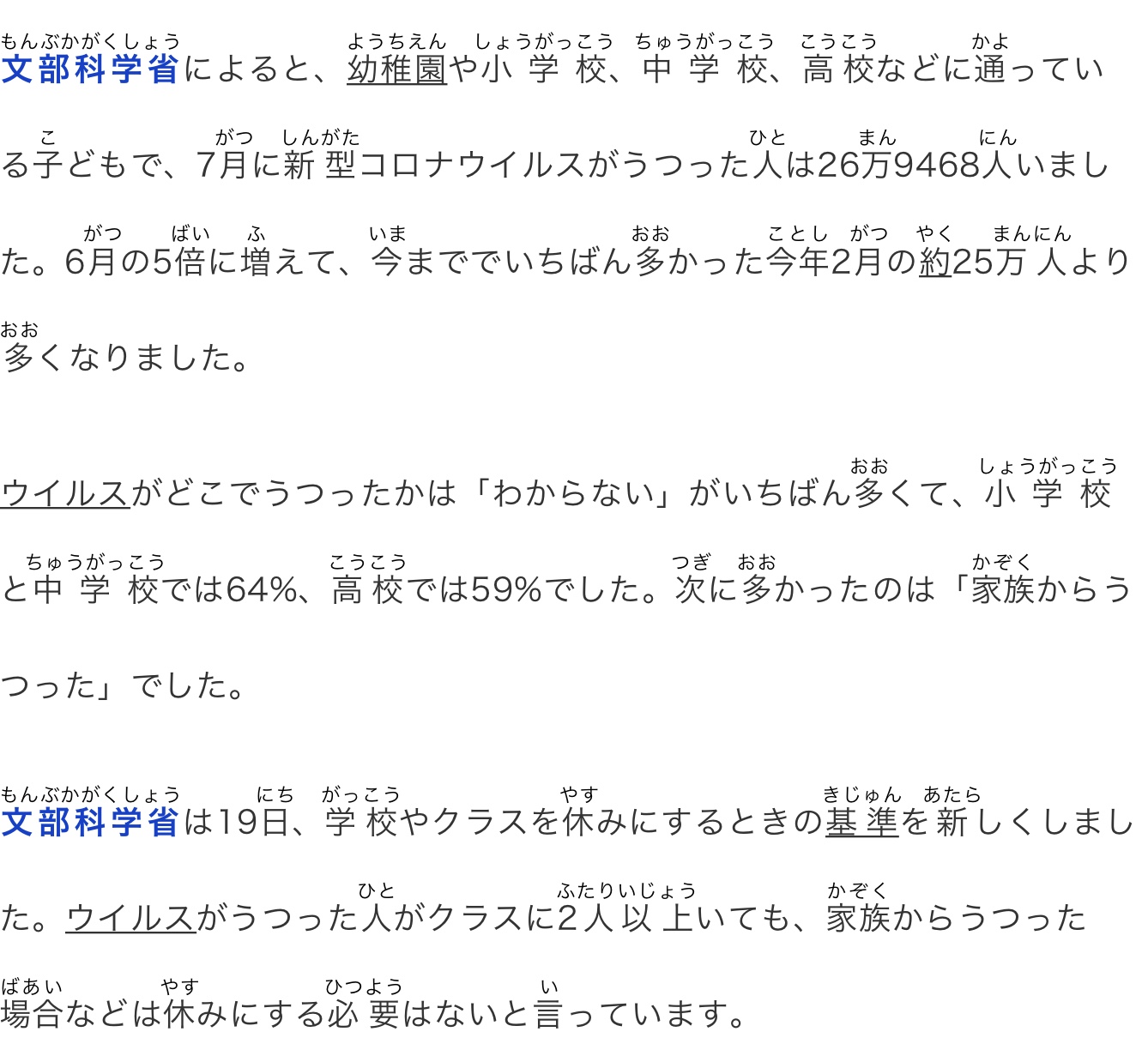文部科学省は19日、学校やクラスを休みにするときの基準を新しくしました。ウイルスがうつった人がクラスに2人以上いても、家族からうつった場合などは休みにする必要はないと言っています。